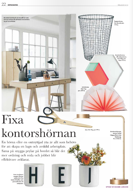 Den senaste veckan har tre personer frågat mig om det där jobbet på Metro Bostad verkligen är ett heltidsjobb. Det är det verkligen, men kanske man inte alltid lägger märke till, när man läser tidningen, vem som har gjort vad. Eftersom jag ägnar så mycket tid åt tidningen och inte alltid hinner blogga så tänkte jag nu visa vad jag gör lite då och då. Den här veckan har jag bland annat gjort ett kontorsplock. Jag blev lite kär i lampan Chipperfield från Wästberg.